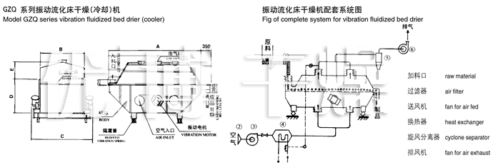 物料自進(jìn)料進(jìn)口進(jìn)入機(jī)內(nèi),在振動(dòng)力作用下,物料沿水平面流化床拋擲,向前連續(xù)運(yùn)動(dòng),熱風(fēng)向上穿過(guò)流化床同濕物料換熱后,濕空氣經(jīng)旋風(fēng)分離器除塵后由排風(fēng)1:3排出.干燥物料由排料進(jìn)口排出。